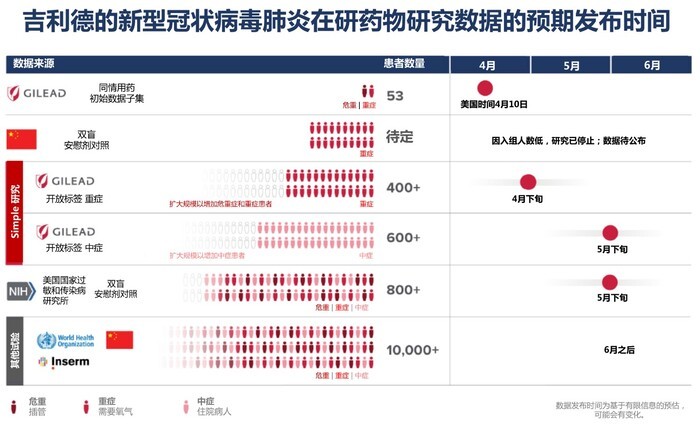 他同时预计,4月底有望获得瑞德西韦针对重症患者研究的初步数据,5月获得有安慰剂对照的NIAID试验初步数据,以及吉利德针对中症患者的研究数据。